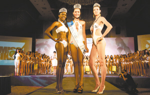 | 5月24日,自制比基尼与最佳身材比赛决出前三名,分别为泰国(中)、肯尼亚(左)、鞑靼小姐夺得。 本报记者 苏建强 摄 |