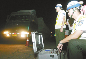 | 在东线高速路定安仙沟服务区,执法人员正在检测超限超载车辆。