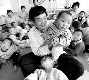 | ← 在河南省汝州市金庚医院的一间康复活动室里,宋兆普和部分脑瘫孤儿在一起玩耍。 |