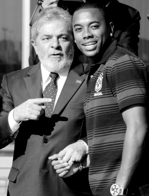5月26日,巴西国家足球队搭乘包机飞往南非参加即将于6月11日开幕的世界杯足球赛。巴西总统卢拉前往机场为球队送行。图为巴西总统卢拉(左)与巴西队球员罗比尼奥握手合影。 新华社发