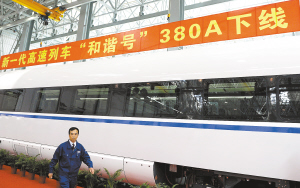 | 刚下线的新一代高速列车“和谐号”380A。 新华社记者 蒋林 摄 |