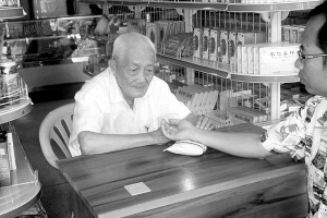 | 百岁老人朱际任在坐诊。 黄兹志 摄 |