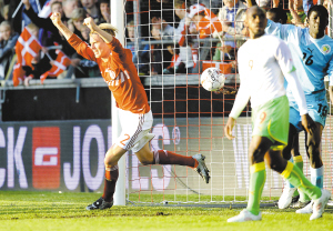| ←28日,在一场世界杯热身赛中,丹麦队以2:0战胜塞内加尔队。图为丹麦队球员鲍尔森(左)进球后庆祝。 新华社发 |