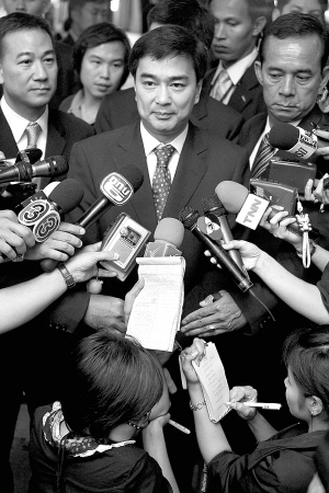 | 5月29日,泰国总理阿披实(中)在首都曼谷会见记者。 新华社/法新 |