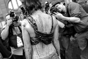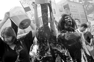 ↑↓5月28日,美国环保主义者在纽约曼哈顿的一家加油站前,身上涂洒黑色颜料,以此抗议墨西哥湾原油不断泄露。