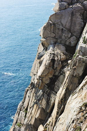 还有不少时间,我开始在这个岛上行走着,仔细端详岛的全貌:一边坡度稍缓,有少量砂土,长着一些野菠萝等灌木植物,另一面是陡峭的岩石悬崖,这片岩石用来崖降或攀岩甚至蹦极都可以,清澈蓝色的海水就在岩石下面平静地涌动着。