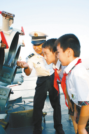 六一国际儿童节来临之际,南海舰队某大队与驻地洋浦小学共同举办了“我的蔚蓝色梦想”、“军营一日游”国防教育活动。活动中,官兵们给学生们介绍部队舰艇主要结构,表演队列动作,教唱革命歌曲,还给学生们赠送了篮球、书包等学习用品。 本报记者 古月 通讯员 胡开元 摄