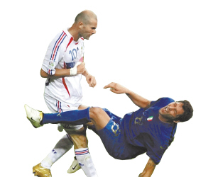齐达内头撞 马特拉齐 2006年世界杯决赛进入到加时阶段,法国队和意大利队的比分仍是1:1。这时不可思议的一幕发生了:齐达内竟然在无球的情况下回头头顶将马特拉齐顶倒在地!齐达内被红牌罚下。没人想到齐达内离开足球的方式如此“另类”。