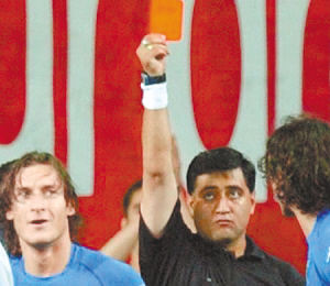 在2002年世界杯韩国队和意大利队的那场比赛中,裁判莫雷诺拙劣的表现让意大利队含泪离去。