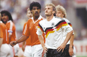 在意大利世界杯八分之一决赛中,荷兰队的里杰卡尔德与西德队的沃勒尔发生冲突,前者向对手吐了口水,两人双双吃到红牌被罚下。