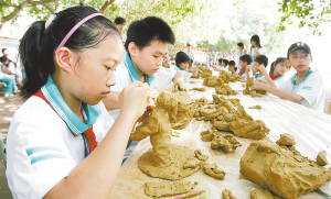 ↑ 5月31日,海口市灵山镇中心小学,60多名小学生在进行泥塑大比拼。 本报记者 李英挺 摄