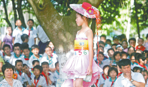 → 5月31日,海口市灵山镇中心小学,孩子们身穿用废品制作的时装一“秀”环保意识。 本报记者 李英挺 摄