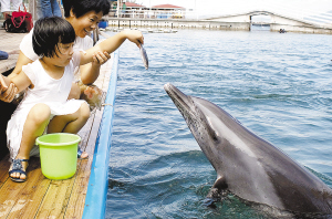 ↑ 5月29日,陵水分界洲岛,一位小游客与海豚亲密接触。 本报记者 宋国强 摄