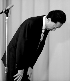| ↑6月2日,在日本首都东京,日本首相鸠山由纪夫宣布辞去首相职务后鞠躬致意。