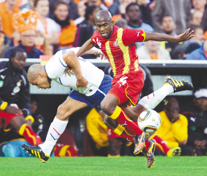 | 6月2日,在荷兰鹿特丹举行的一场世界杯热身赛中,荷兰队以4比1战胜加纳队。图为荷兰队球员德容(左)与加纳队球员阿莫亚争抢。 新华社发 |