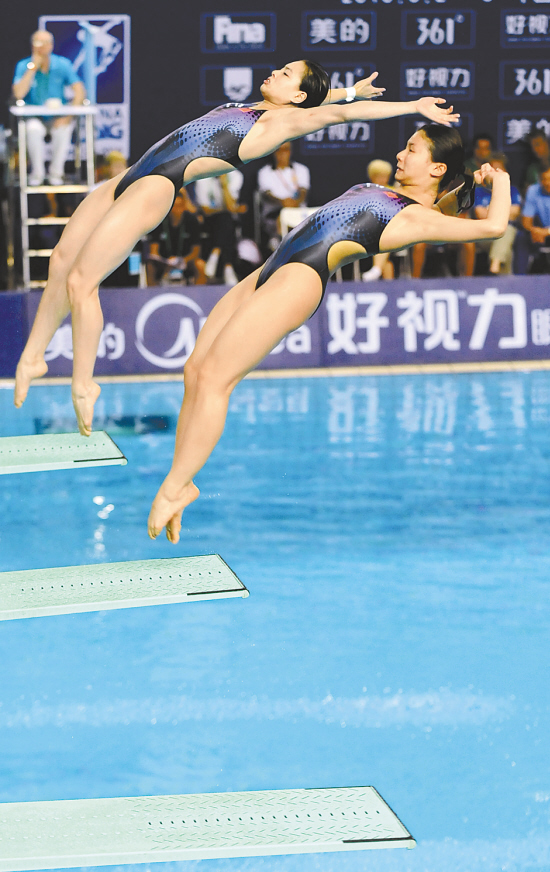 6月2日,国际泳联跳水世界杯赛奥运项目比赛在江苏常州举行。图为中国选手吴敏霞/何姿在女子双人3米跳板预赛中排名第一,顺利晋级。 新华社发