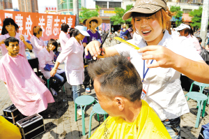 6月3日,义务理发师在为农民工免费理发。 当日,宁夏银川市红玫瑰美容美发学校组织该校20多名义务理发师来到银川市南门劳务市场,为农民工开展免费理发服务,受到广大农民工的欢迎。 新华社记者 王鹏 摄