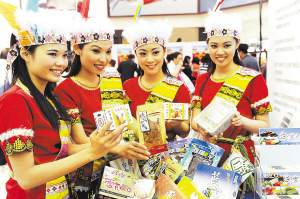 6月3日,身着台湾高山族服饰的姑娘正在展示地道的台湾食品。 6月3日至9日,香港10家JUSCO百货共同举办“2010台湾食品节”,数百种地道的台湾美食精品亮相香港,吸引不少市民和游客前来品尝。 新华社记者 宋振平 摄