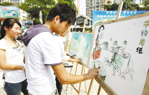 为纪念第39个世界环境日,6月5日,海口市沿江五路绿岛家园广场,10多名海南师范大学学生以环保为主题,用漫画形式宣传“低碳减排、绿色生活”,告诉人们在工作和生活中要节约用纸。该活动由省国土环境资源厅主办。 本报记者 苏晓杰 摄