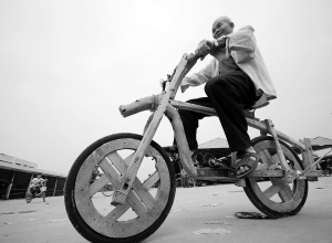 6月5日,许本豪老人骑着他打造的木制自行车上路。 近日,家住广东省汕头市澄海区莲下镇南湾村的许本豪老人骑着一辆木制自行车上路,吸引了众多乡亲的目光。据了解,许本豪今年74岁,年轻时做过木匠,这辆独一无二的自行车是他从2009年底开始、历时半年时间手工打造的。 新华社发