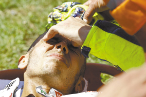 6月5日,雅马哈车队的意大利“摩托车天王”罗西在穆杰洛进行的意大利大奖赛第二次训练中发生事故后导致腿部骨折。今年31岁的罗西被称为车坛“小飞侠”,他曾经9次获得世界冠军,其中有七次是在MotoGP组别中获得的。图为罗西受伤后被抬上担架。 新华社发