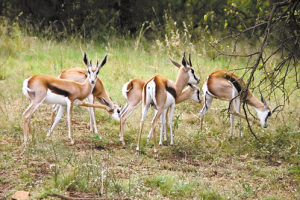 我们去参观这些野生动物需要乘坐一种特殊的卡车,车的周围有铁栏杆保护,以防被动物袭击。这里的保护区大部分没有围栏,在里面可以看到南非小羚羊(跳羚)、长颈鹿、条纹鬣狗、狮子、猎豹等野生动物。其中猎豹给人的印象非常深刻,猎豹是所有大型猫科动物中最温顺的一种,一般不主动攻击人,易于驯养,身上有斑点,在双眼下面有黑点,称为泪痕。据南非祖鲁族传统故事说,猎豹的泪痕是因为猎人偷走了母猎豹的孩子后哭出来的。酒店的女主人绘声绘色地给我们讲述这个有趣的故事,我们忍不住去抚摸一下猎豹,通常情况下是没有什么危险的。