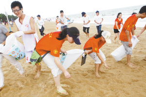 6月6日,海南大学、海南师范大学等院校百名环保志愿者,来到海口假日海滩进行地毯式清洁活动,不少游客也主动参与其中。此次活动是为迎接6月8日“世界海洋日”的到来而开展的。 本报记者 苏晓杰 摄