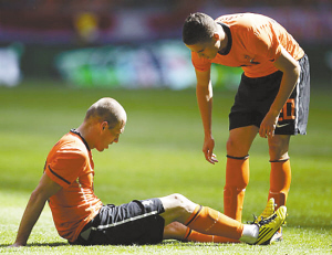 本报讯 在6月5日进行的一场热身赛中,荷兰队在主场6:1战胜来访的匈牙利。荷兰队边锋罗本在比赛中替补出场,打进2球帮助球队赢得比赛,但在最后时刻,罗本痛苦倒地,并随即下场。据初步预测,罗本的伤情为韧带拉伤。