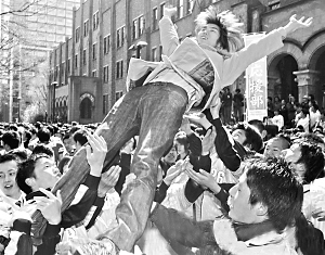 | ← 考入京都大学的日本学生被同学抛向半空,接受祝福。 |