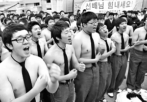 | → 韩国低年级的学生集体为师兄师姐们加油,预祝他们考得高分。 |