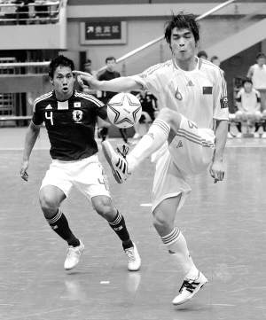 6月8日,室内五人制足球国际锦标赛在杭州举行,中国队在首场比赛中以1:7不敌日本队。图为中国队球员张习(右)在比赛中传球。 新华社发