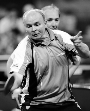 6月8日,第十五届世界元老乒乓球锦标赛在呼和浩特继续进行。图为捷克运动员采卡瓦·米洛斯拉夫(前)和搭档在男子双打比赛中。 新华社发