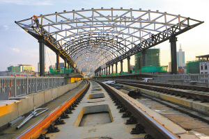 6月8日下午6时,一名工人在东环铁路海口城西站焊接最后一根钢梁。至此,东环铁路唯一汽车站无缝隙对接火车站———海口城西站主体建成。 本报记者 古月摄