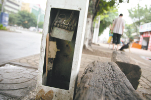 | 海口市海秀中路上遭到不法分子破坏的路灯灯杆偏门。 本报记者 张杰 摄 |