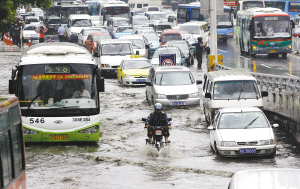 6月8日,众多车辆在武汉城区一条积水严重的道路上缓慢行驶。 6月7日至8日,武汉遭遇暴雨袭击,城区一些低洼地带严重积水,对人们出行造成影响。 新华社发 (邓刚 摄)