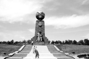 | 在塔什干,环卫工人在独立与人道主义纪念碑前工作。