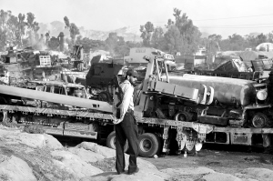 6月9日,在巴基斯坦首都伊斯兰堡附近,一名警察在被毁的北约车辆旁警戒。 由约50辆油料和物资运输车组成的北约车队8日深夜在巴基斯坦首都伊斯兰堡附近遭到不明身份武装分子袭击,造成至少8人死亡、6人受伤,30多辆车被焚毁。 新华社/路透