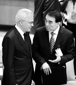 | 6月9日,在纽约联合国总部安理会会议厅,中国常驻联合国代表李保东(右)与俄罗斯常驻联合国代表丘尔金交谈。当日,安理会就制裁伊朗决议草案进行投票表决。 新华社记者 申宏 摄 |