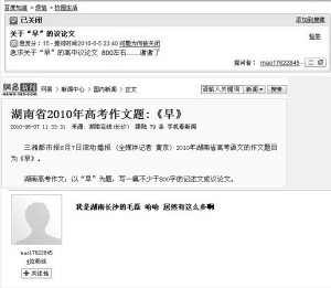 前天是2010年全国高考首日,在上午考完语文后,湖南一网民通过网站报料称,当地一网名为“mao17622845”的网友竟然在高考前的6月5日发帖,“急求关于‘早’的高中议论文,800字就可以”。而这个题目和湖南省今年的高考作文“以“早”为题,写一篇不少于800字的记述文或议论文”一模一样。