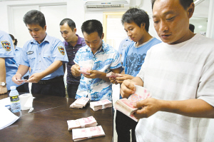 六月九日下午四时许,一百五十五名被三亚红沙某建筑工地拖欠薪酬的农民工,来到三亚市劳动保障监察支队,高兴地领回了工程项目方支付的六百零一万元血汗钱。农民工们喜笑颜开地说:“感谢政府部门帮我们讨回了工钱。” 特约记者 孙清 摄影报道