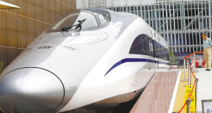 我国新一代高速动车组列车被放置在世博园中国铁路馆外。这种带有CRH380A标志的新一代高速动车组,最高运行时速可达380公里。 新华社发