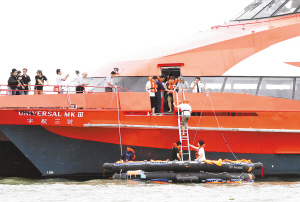 6月10日,救援人员协助乘客从“发生意外”的客船撤离。 当日,来自广东省、香港和澳门的海上搜救单位在澳门国际机场以东海面举行海上搜救联合演练,以加强应对大型海上意外及突发事件的能力。 新华社发