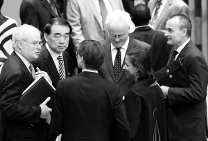 6月9日,在纽约联合国总部安理会会议厅,英国常驻联合国代表马克·格兰特、中国常驻联合国代表李保东、德国常驻联合国代表彼得·魏提格、俄罗斯常驻联合国代表丘尔金、美国常驻联合国代表苏珊·赖斯、法国常驻联合国代表阿罗德(从左至右)在交谈。当日,在纽约联合国总部,中国、美国、俄罗斯、英国、法国和德国在安理会通过有关制裁伊朗的第1929号决议后发表六国外长联合声明,重申六国致力于通过谈判努力实现伊朗核问题的早日解决。声明说,决议反映了国际社会对伊朗核计划的担忧,但同时也为六国“继续与伊朗进行接触敞开着大门”。 新华社发