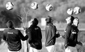 10日,意大利队在南非艾琳训练,备战即将于6月11日开始的世界杯。图为意大利队球员夸利亚雷拉(右一)、卡纳瓦罗(左一)与队友在训练中。 新华社发