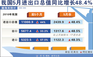 据海关统计,今年前5个月,我国外贸进出口总值11000.9亿美元,比去年同期增长44%。其中出口5677.4亿美元,增长33.2%;进口5323.5亿美元,增长57.5%。在出口商品中,机电产品出口保持快速增长,劳动密集型的传统大宗商品出口增速普遍加快。