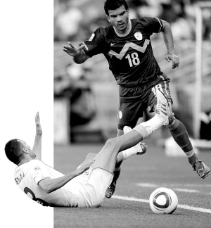 | 13日,在波罗瓜尼举行C组比赛中,阿尔及利亚队0:1不敌斯洛文尼亚队。图为阿尔及利亚队球员贝尔哈吉(下)在拼抢中倒地。 新华社发