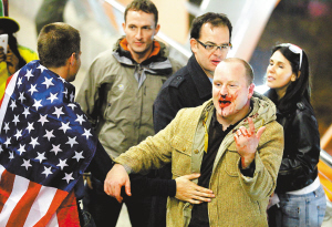6月12日晚,在英格兰队与美国队的比赛中,两队球迷发生冲突,一名美国球迷(右二)被英国球迷打得鲜血直流。 新华社发