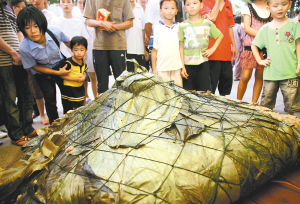6月13日,首届海南定安端午美食文化节活动现场,一只三百多公斤重的“粽王”吸引了很多市民。 本报记者 张杰 摄