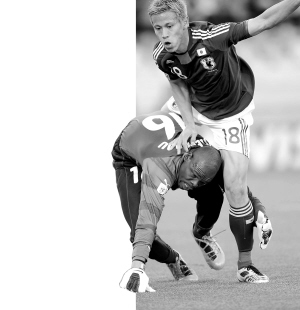 | →日本队球员本田圭佑(上)与喀麦隆队守门员苏莱曼努在比赛中拼抢。