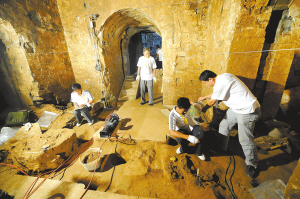 图为考古人员在现场清理。 近日,记者从河南省文物局获悉,安阳西高穴曹操高陵陵园布局基本搞清,这是一座方形陵园,墓前有广场,呈现出“前朝后寢”式的建筑布局。据有关人士表示,拟在曹操高陵规划建设国家级考古遗址公园,在曹操墓本体上规划建设遗址博物馆。 新华社记者 朱祥 摄